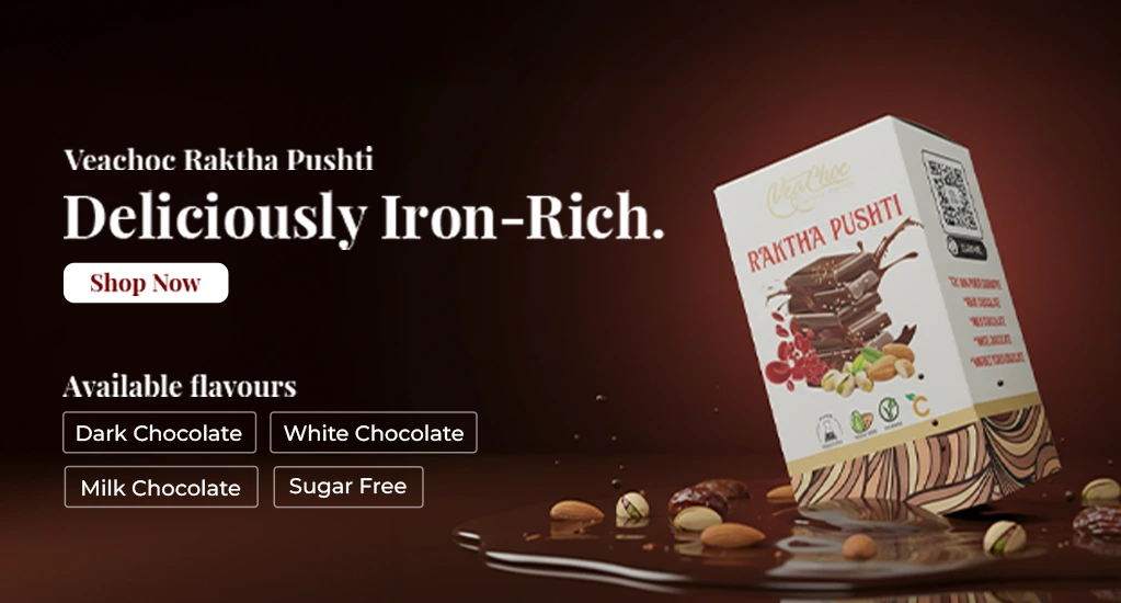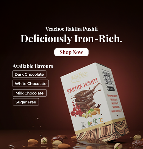 VeaChoc Rakthapushti is crafted with a harmonious blend of ground chocolate, natural seeds (Flax, Nigella, Sesame, Chia), grains (Ragi, Rajgira), and nuts (Almonds, Pistachios, Dates). This variant, crafted without cocoa solids, features a delightful blend of iron-rich seeds and dry fruits. Combined with milk solids and a touch of natural sweetener (Khandasari/Sulphur-free sugar), it offers a remarkably sweet and satisfying flavor.