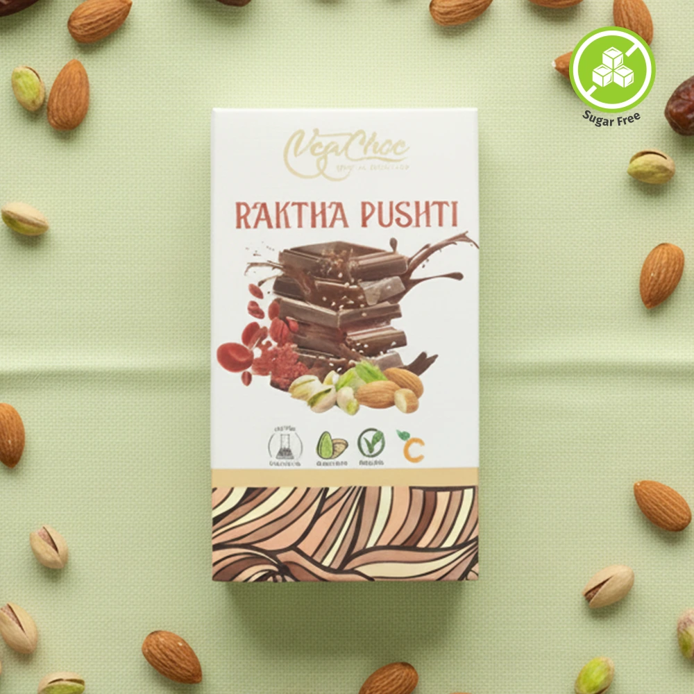 VeaChoc Rakthapushti is crafted with a harmonious blend of ground chocolate, natural seeds (Flax, Nigella, Sesame, Chia), grains (Ragi, Rajgira), and nuts (Almonds, Pistachios, Dates). This variant, crafted without any form of sweetner, showcases a harmonious blend of iron-rich seeds and dried fruits Combined with rich cocoa and milk solids, it offers a bittersweet taste profile, where the intensity of the cocoa dominates.